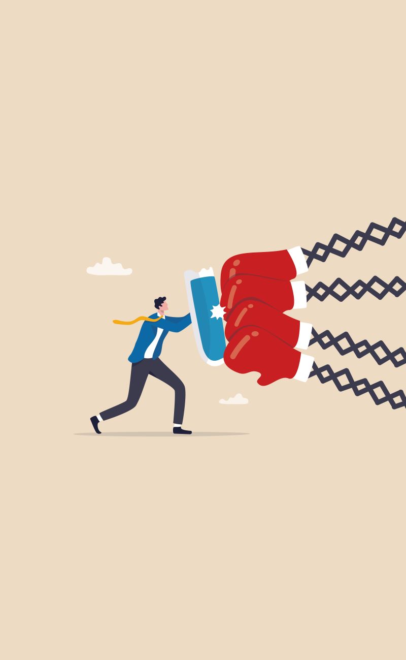 BIld: ein Mensch hält ein Schild gegen überdimensionale Boxhandschuhe