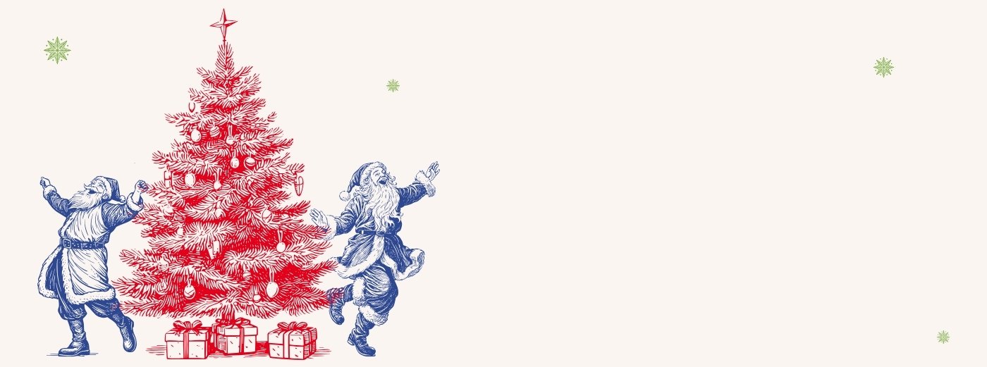 Bild: gezeichnet, zwei Weihnachtsmänner tanzen um einen Weihnachtsbaum