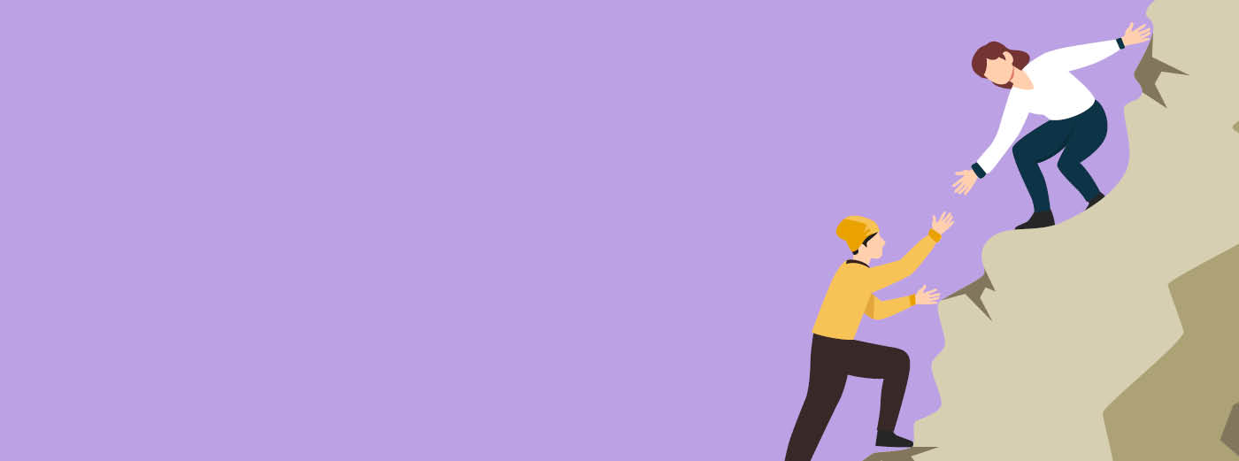 Banner: ein Mensch hilft einem anderen einen steinigen Berg hoch