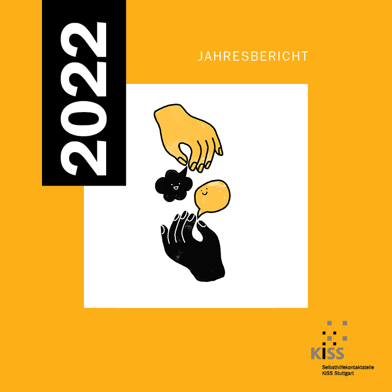 Bild: Cover Jahresprogramm mit gezeichneten Händen, die freundliche Sprechblasen halten
