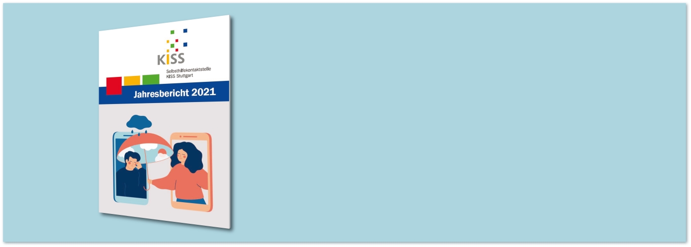 Bild: Titelseite Jahresbericht, zwei Menschen schauen sich aus Handys heraus an, eine hält der anderen einen Regenschirm über den Kopf, sie wirkt niedergeschlagen.