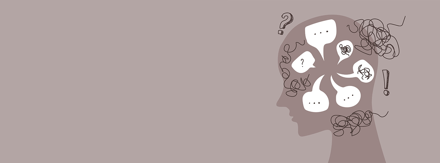 Bild: Umriss eines Kopfes mit Gedankenblasen und Gedankenknäuel darin