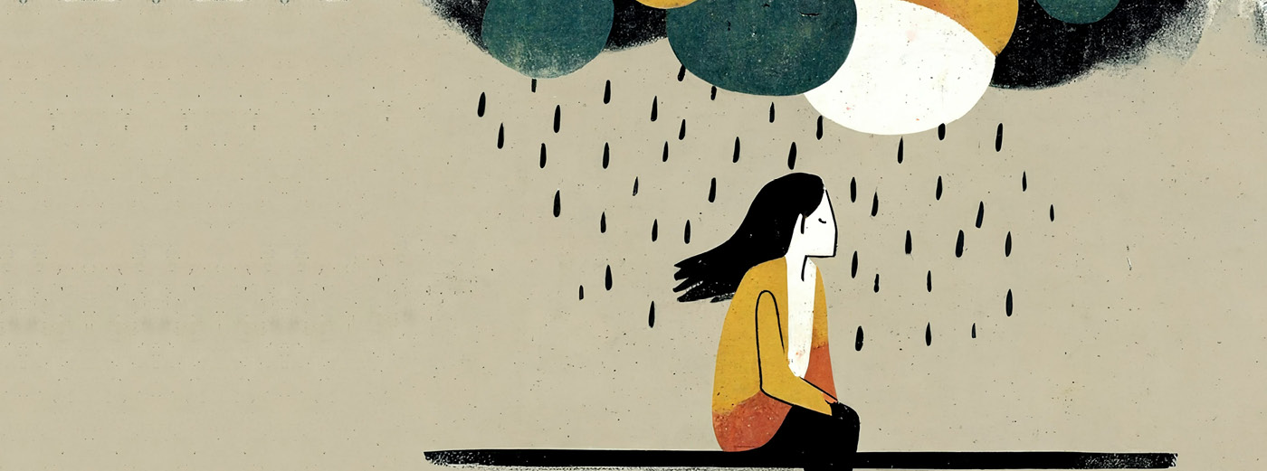 Banner: Eine Frau sitzt in der MItte, ringsum zeigen Finger auf sie