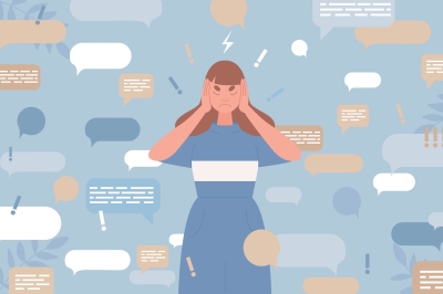 Bild: gezeichnete Frau vor blauem Himmel mit roten Wolken, ihr Kopf platzt und zerbricht in Stücke
