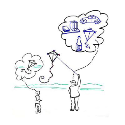Bild: zwei Menschen lassen Drachen steigen, Gedankenblasen